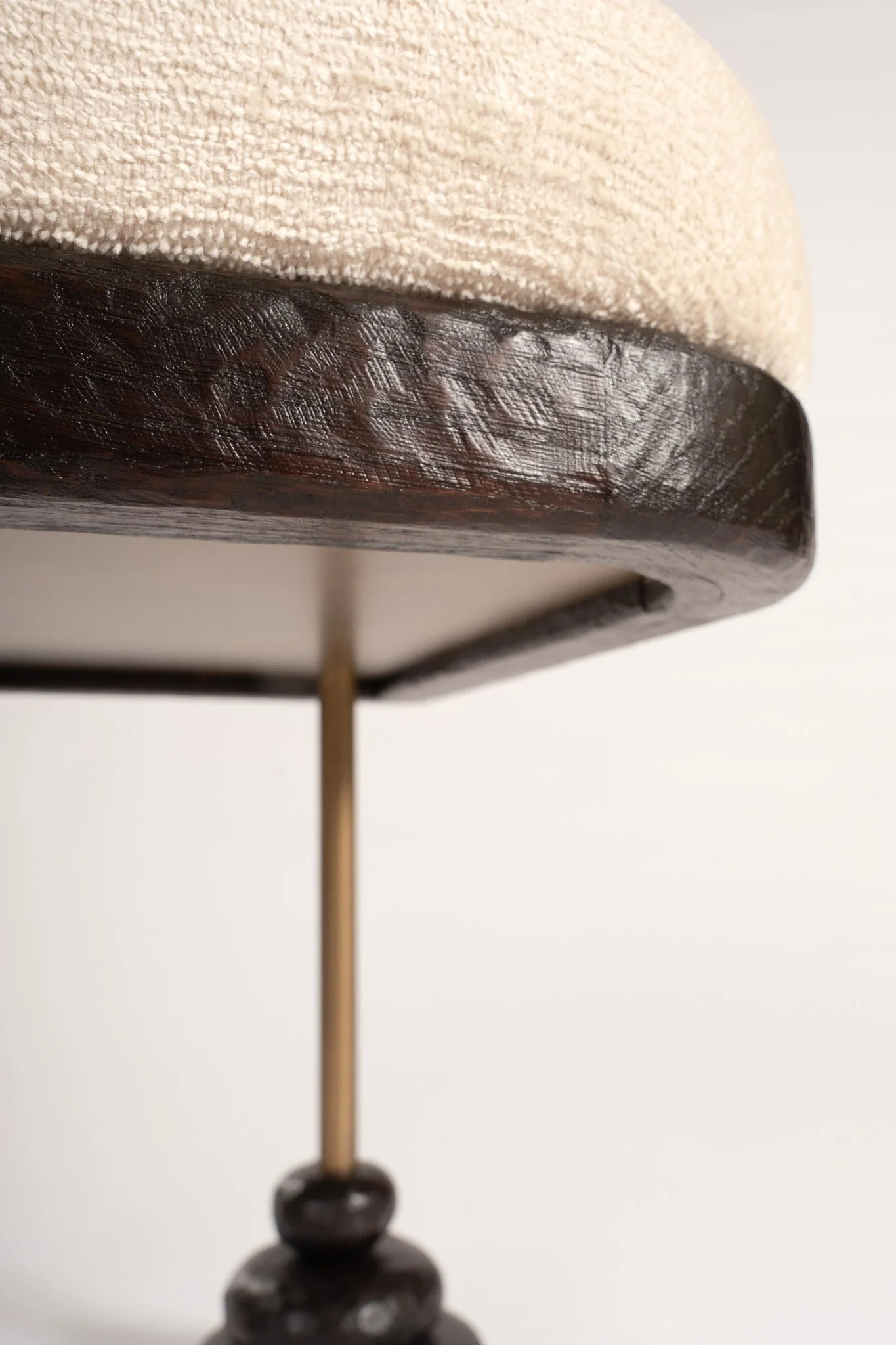 Matières : Chêne teinté et sculpté, laiton patiné, tissu Misia.