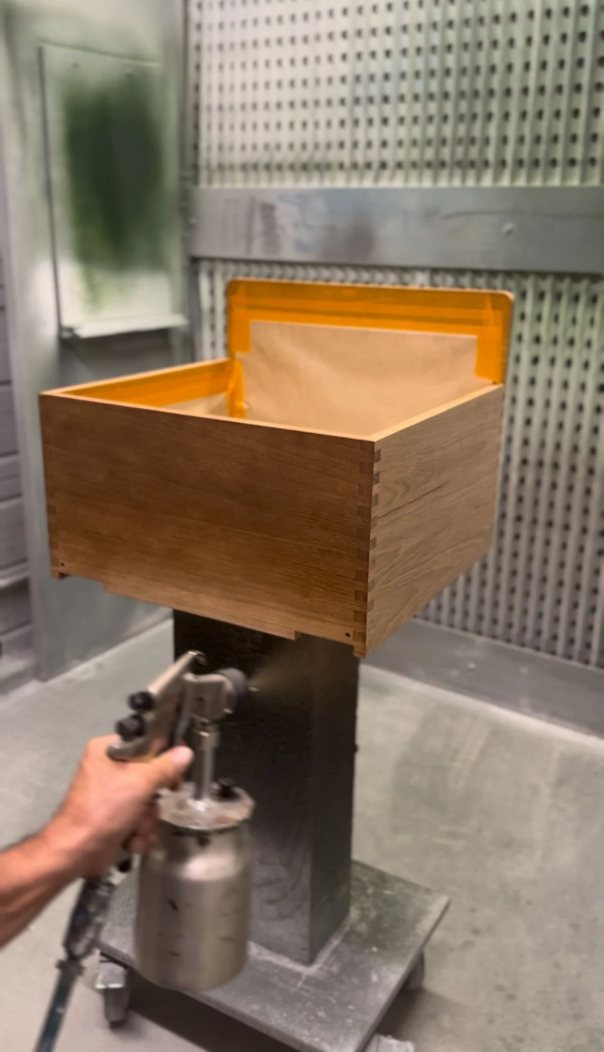 L’enfilade Diplopoda a été teintée et vernie en cabine, un procédé qui garantit une finitions uniforme et précise, tout en respectant la texture et le veinage naturel du bois. Cette méthode permet d’obtenir un résultat esthétique haut de gamme, fidèle à la teinte chêne miel développée sur mesure pour le projet.