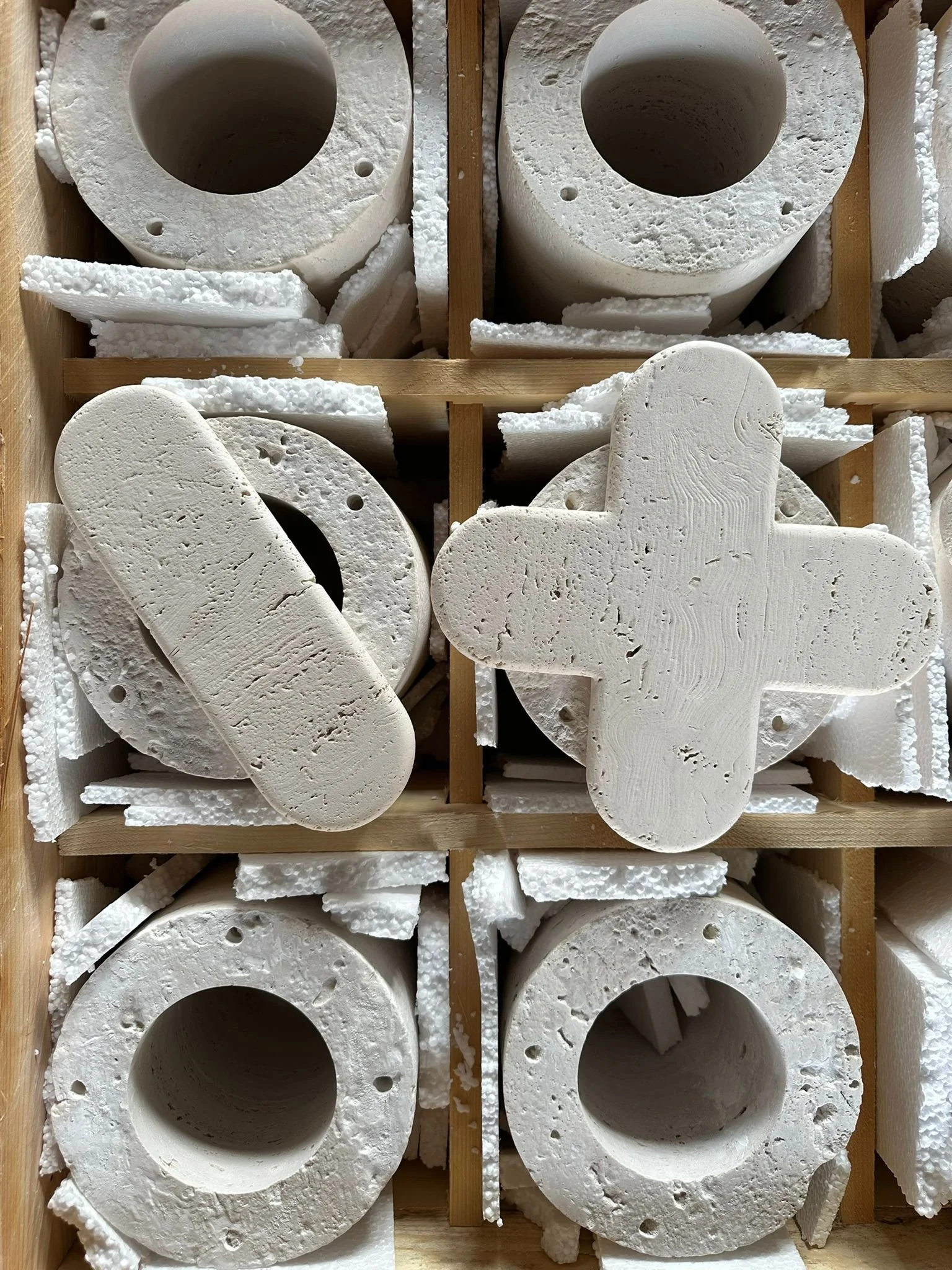 Pour la réalisation des poignées et des dix pieds en travertin italien de l’enfilade Diplopoda, nous avons assuré la supervision complète de la fabrication sur mesure auprès de la carrière spécialisée en Italie. Notre rôle a consisté à contrôler chaque étape du processus, du choix des blocs de pierre à l’usinage précis, afin de garantir que les pièces répondent aux exigences de design contemporain, d’esthétique haut de gamme et de durabilité. Cette coordination nous a permis de créer des éléments minéraux parfaitement intégrés au meuble, en parfaite harmonie avec le chêne massif et plaqué chêne et le design imaginé par Appartement 2